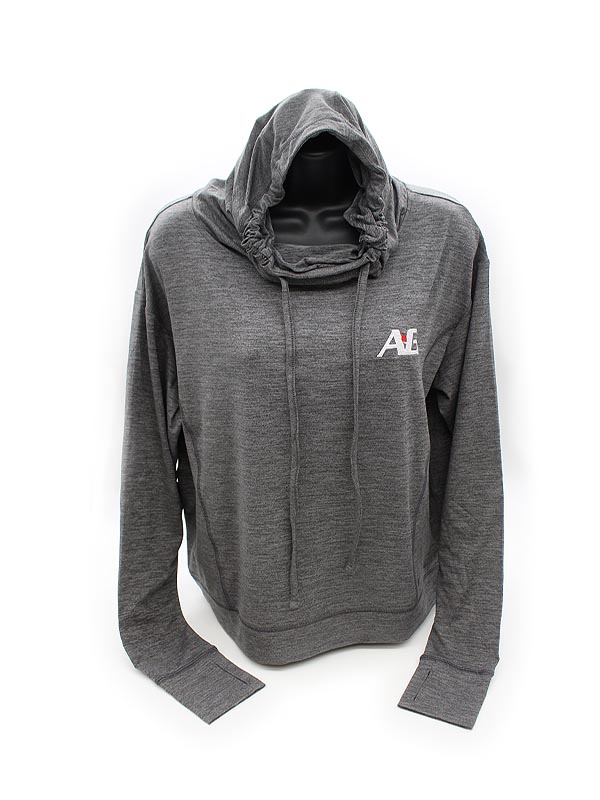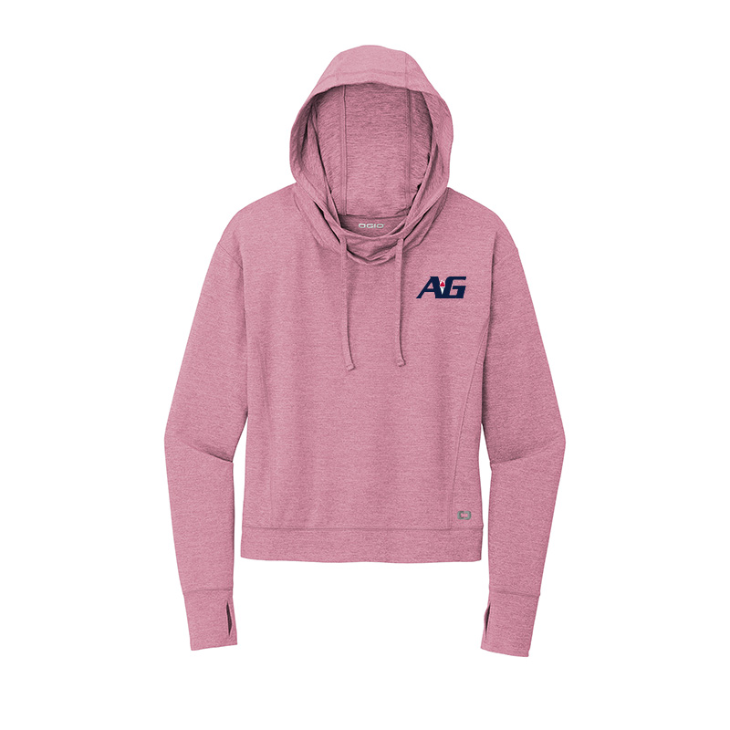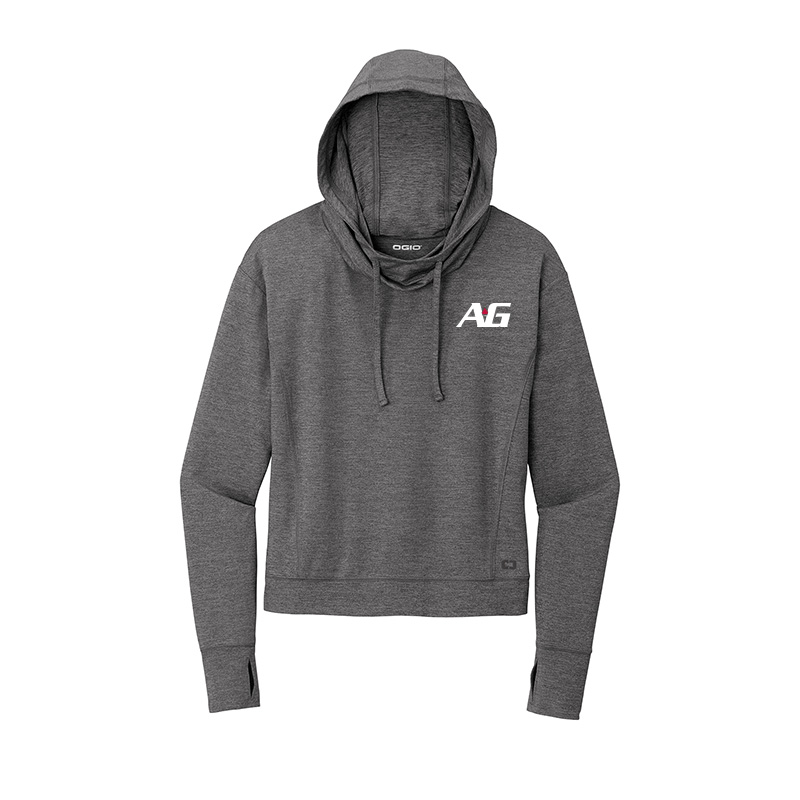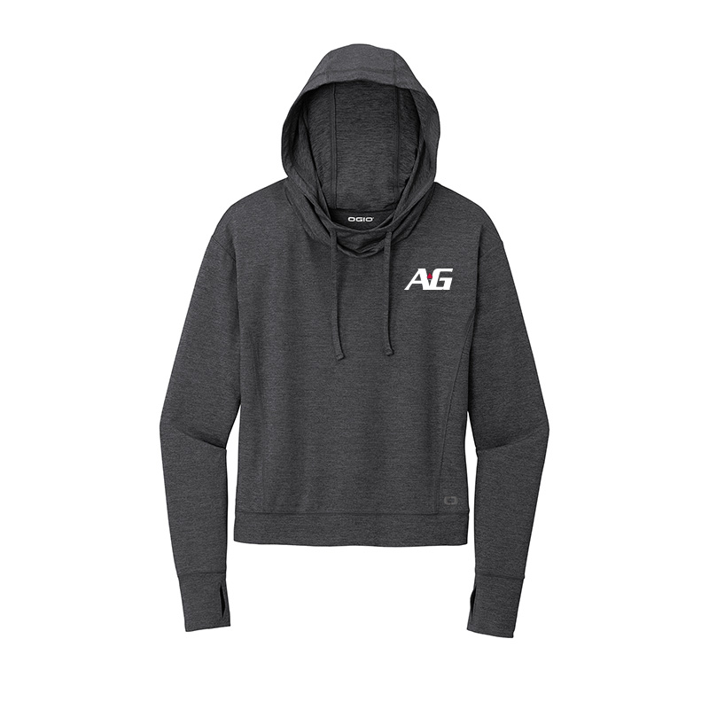 Black reflective O heat transfer on left hem and A-G logo embroidered on left chest